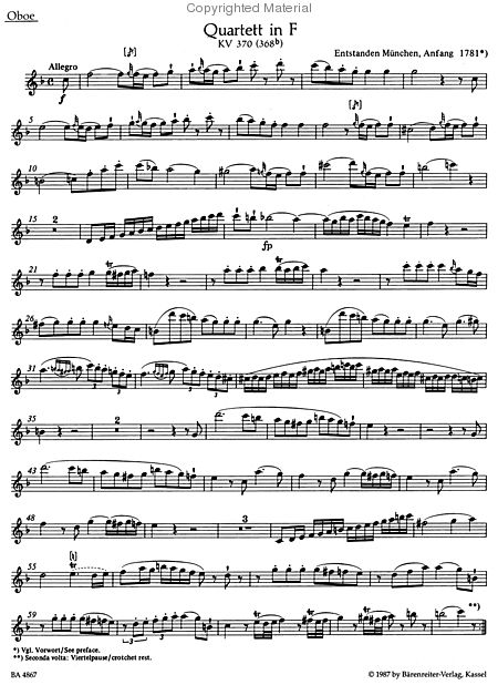 Hobojový kvartet F Dur (hoboj, housle, viola, violoncello) : Jedna z nejznámějších skladeb pro hoboj, kterou napsal Wolfgang Amadeus Mozart.